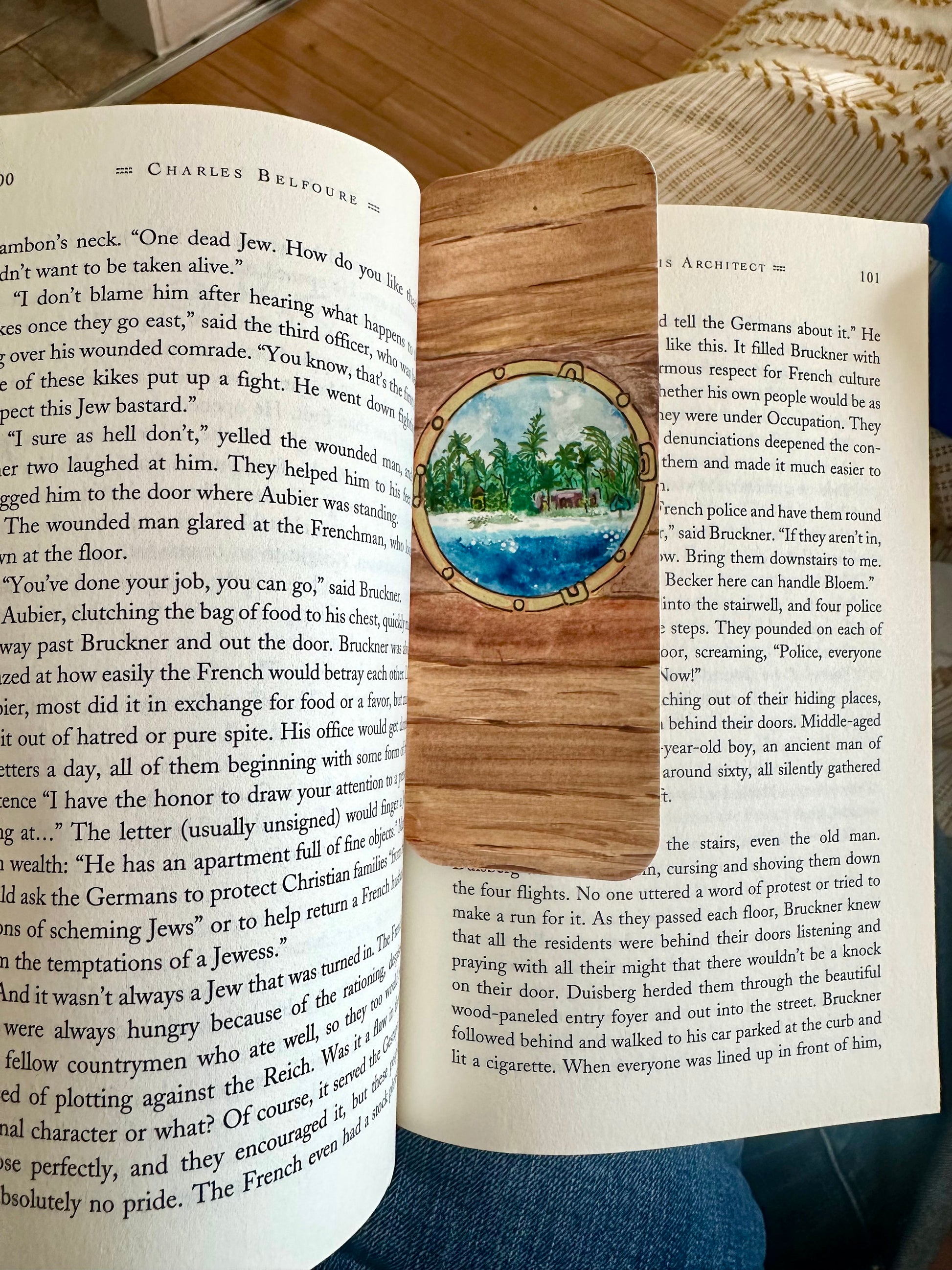Hand-painted watercolor bookmark featuring a serene tropical beach scene anchored by an adorable pink beach house.